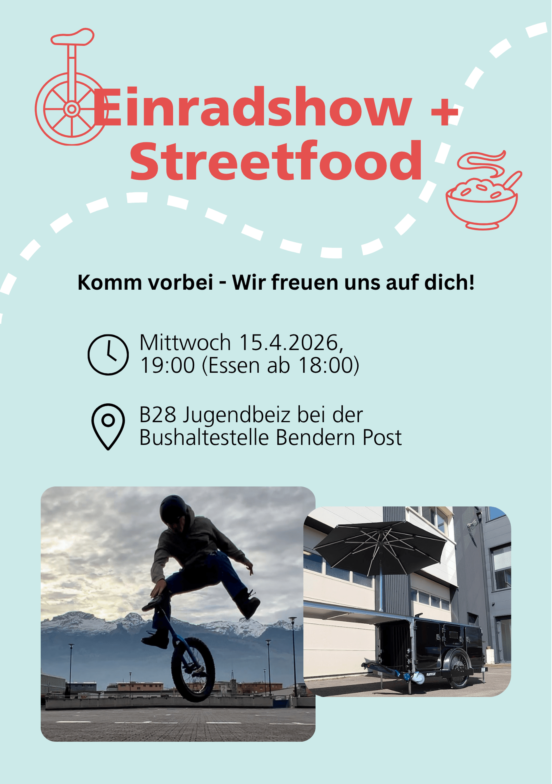 Das Team des B28 zeigt coole Tricks mit dem Einrad, gefolgt von spannenden Vorträgen von Veloreisenden in denen sie über ihre Erlebnisse mit dem Fahrrad erzählen werden. Ort: B28 Jugendbeiz in Bendern. Ausserdem bereitet das Streetwork-Team für uns ein Essen zu: Ab 18:00 Uhr gibt es eine kostenlose Mahlzeit für alle Interessierten. Über freiwillige Spenden freut sich das Team sehr.